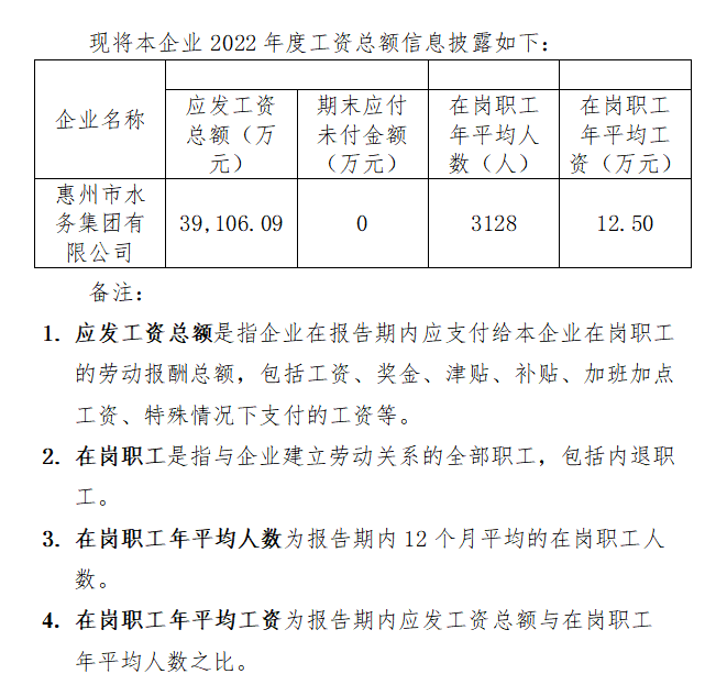 2022年惠州市水務(wù)集團(tuán)有限公司工資總額信息披露